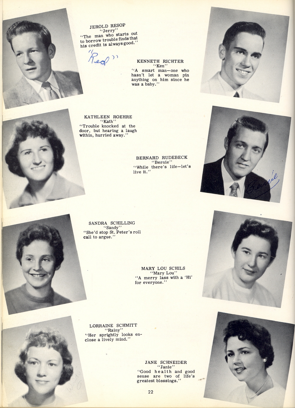 1958 Sheboygan Falls High School, Pages 22 and 92: Jerold Resop, Kenneth Richter, Kathleen Roehre, Bernard Rudebeck, Sandra Schilling, Mary Lou Schils, Lorraine Schmitt, Jane Schneider.