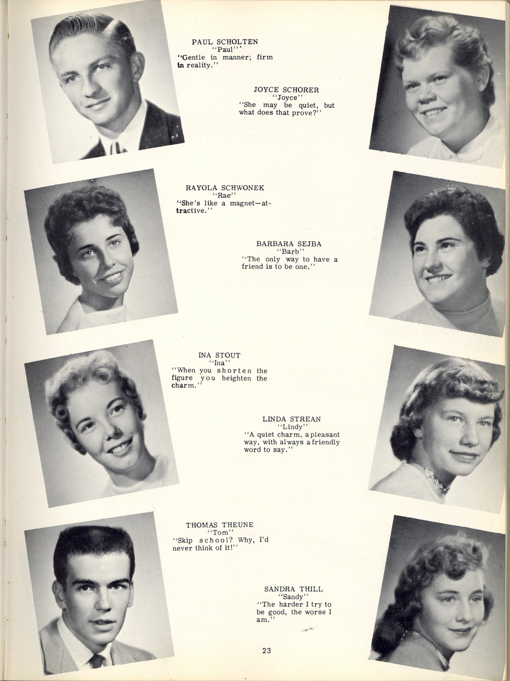 1958 Sheboygan Falls High School, Pages 23 and 93: Paul Scholten, Joyce Schorer, Rayola Schwonek, Barbara Sejba, Ina Stout, Linda Strean, Thomas Theune, Sandra Thill.
