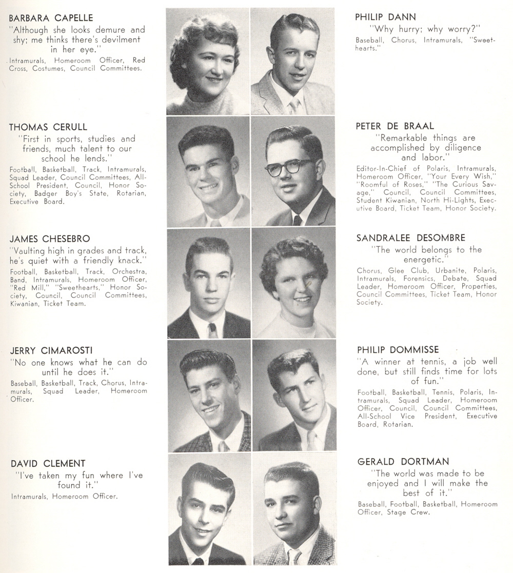 1958 Sheboygan North High School, Page 19: Barbara Capelle, Thomas Cerull, James Chesebro, Jerry Cimarosti, David Clement, Philip Dann, Peter De Braal, Sandralee Desombre, Philip Dommisse, Gerald Dortman.