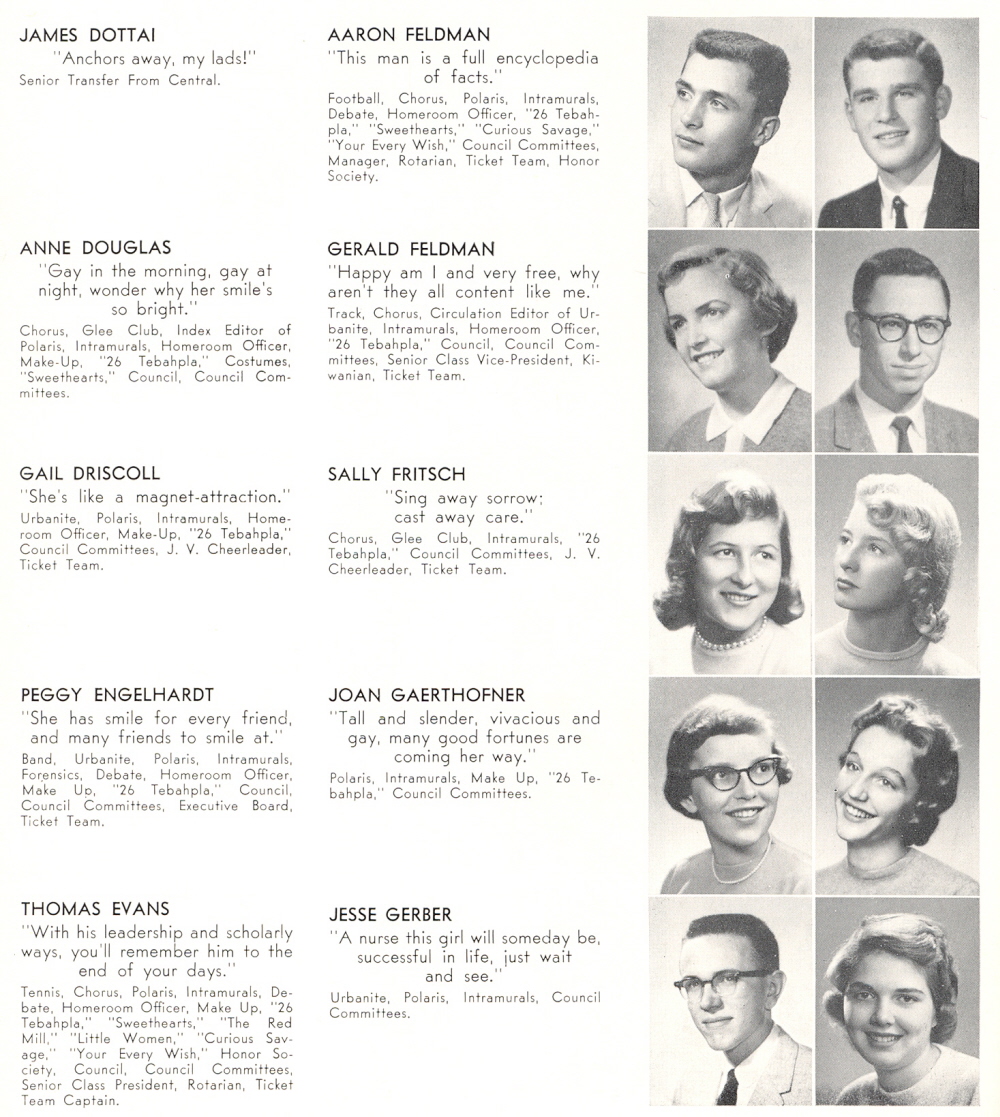 1958 Sheboygan North High School, Page 20: James Dottai, Anne Douglas, Gail Driscoll, Peggy Engelhardt, Thomas Evans, Aaron Feldman, Gerald Feldman, Sally Fritsch, Joan Gaerthofner, Jesse Gerber.