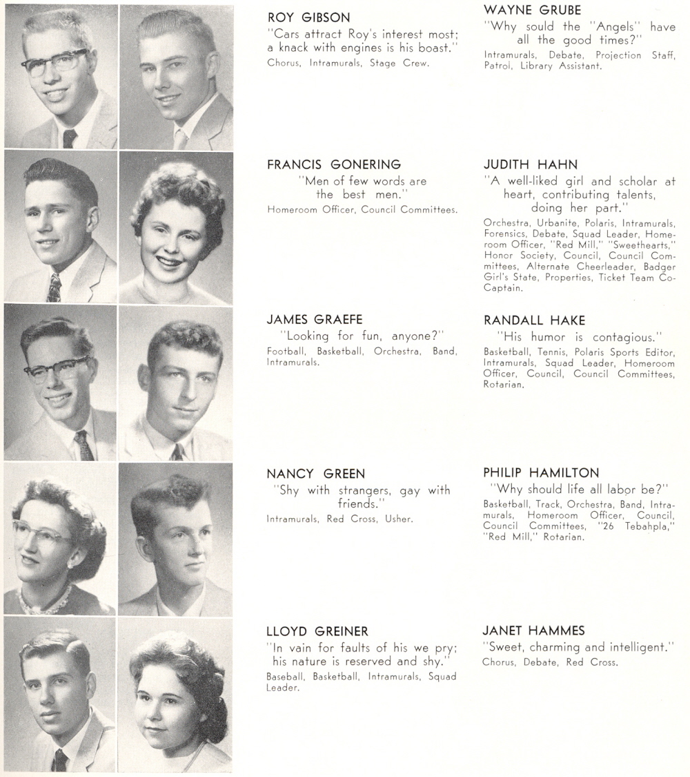 1958 Sheboygan North High School, Page 21: Roy Gibson, Francis Gonering, James Graefe, Nancy Green, Lloyd Greiner, Wayne Grube, Judith Hahn, Randall Hake, Philip Hamilton, Janet Hammes.