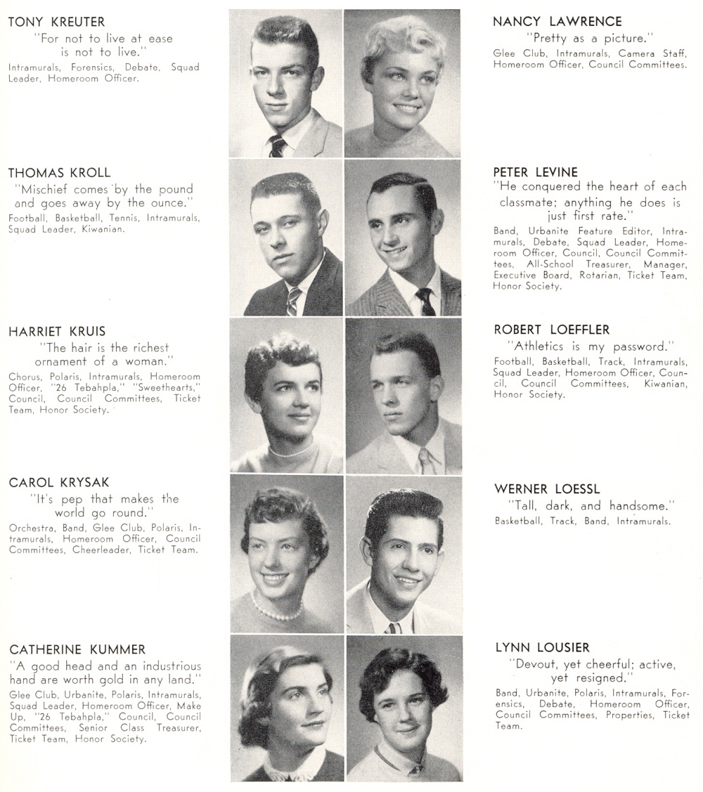 1958 Sheboygan North High School, Page 25: Tony Kreuter, Thomas Kroll, Harriet Kruis, Carol Krysak, Catherine Kummer, Nancy Lawrence, Peter Levine, Robert Loeffler, Werner Loessl, Lynn Lousier.
