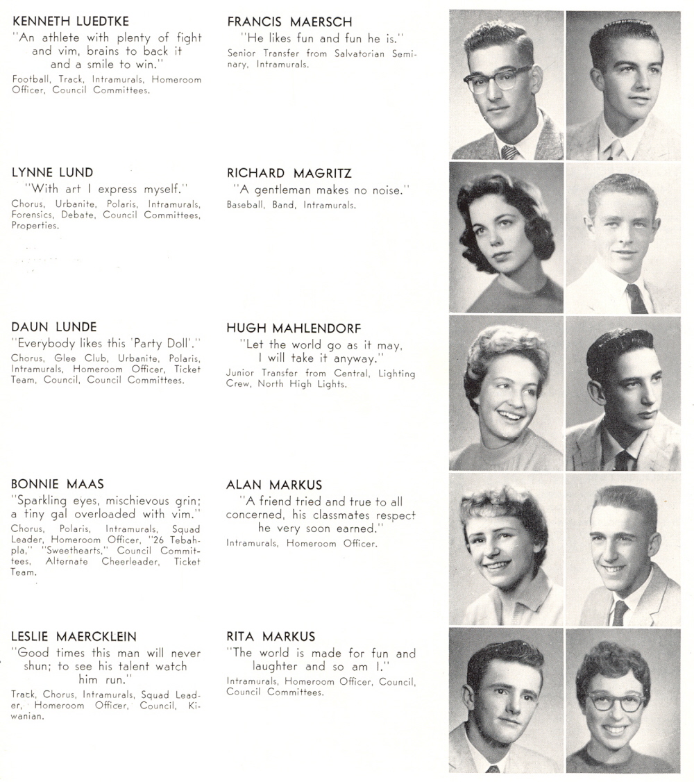 1958 Sheboygan North High School, Page 26: Kenneth Luedtke, Lynne Lund, Daun Lunde, Bonnie Maas, Leslie Maercklein, Francis Maersch, Richard Magritz, Hugh Mahlendorf, Alan Markus, Rita Markus.