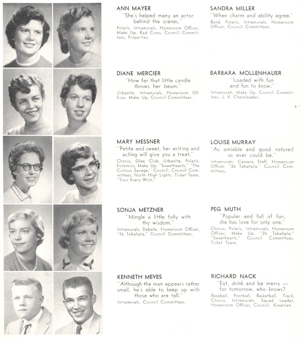 1958 Sheboygan North High School, Page 27: Ann Mayer, Diane Mercier, Mary Messner, Sonja Metzner, Kenneth Meves, Sandra Miller, Barbara Mollenhauer, Louise Murray, Peg Muth, Richard Nack.