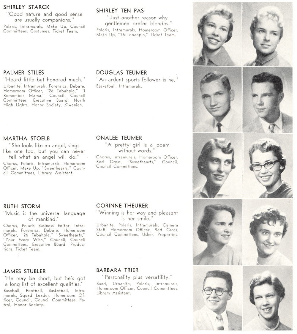 1958 Sheboygan North High School, Page 32: Shirley Starck, Palmer Stiles, Martha Stoelb, Ruth Storm, James Stubler, Shirley Ten Pas, Douglas Teumer, Onalee Teumer, Corinne Theurer, Barbara Trier.