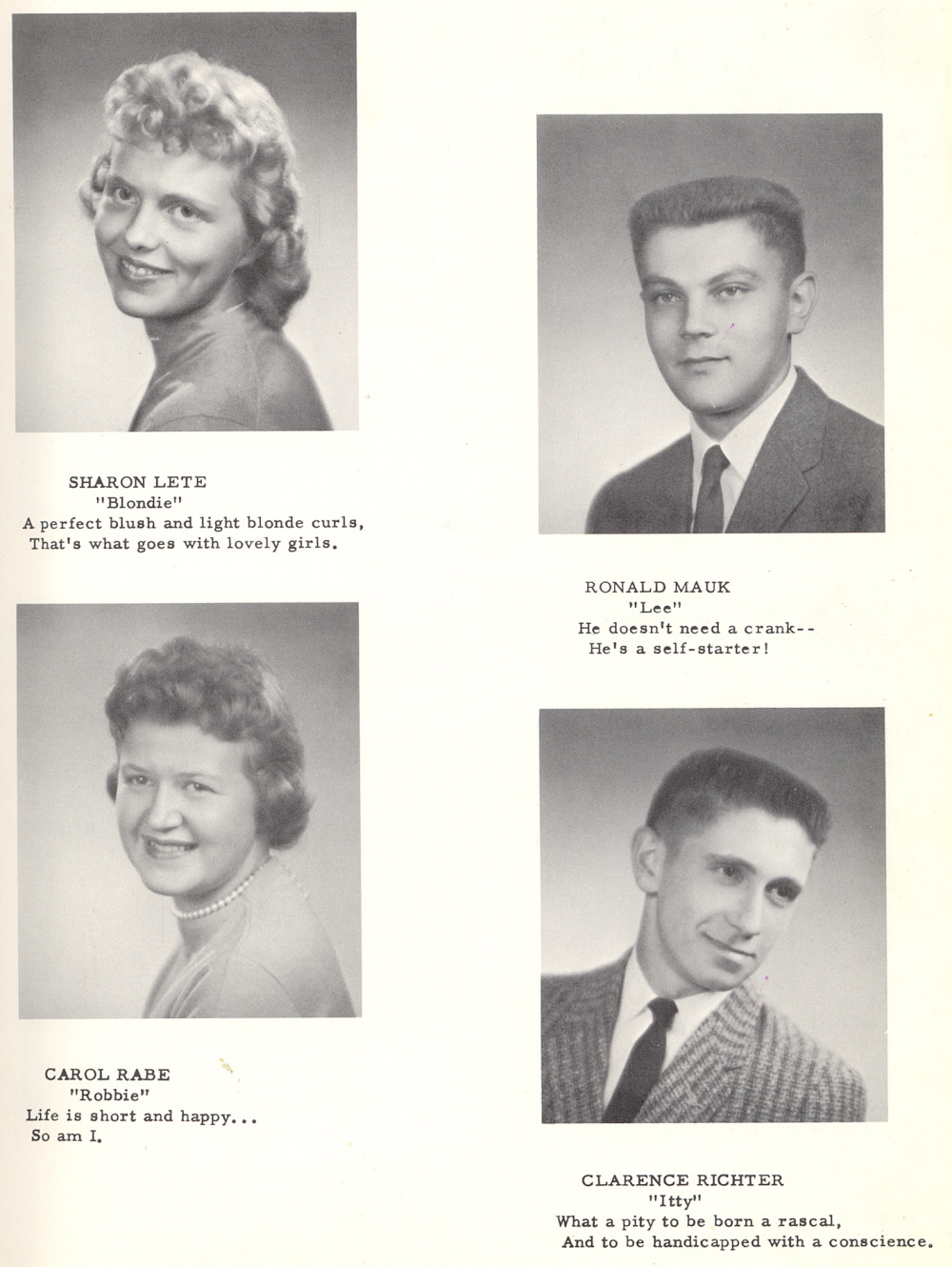 1959 Elkhart Lake High School, Page 13: Sharon Lete, Ronald Mauk, Carol Rabe, Clarence Richter.