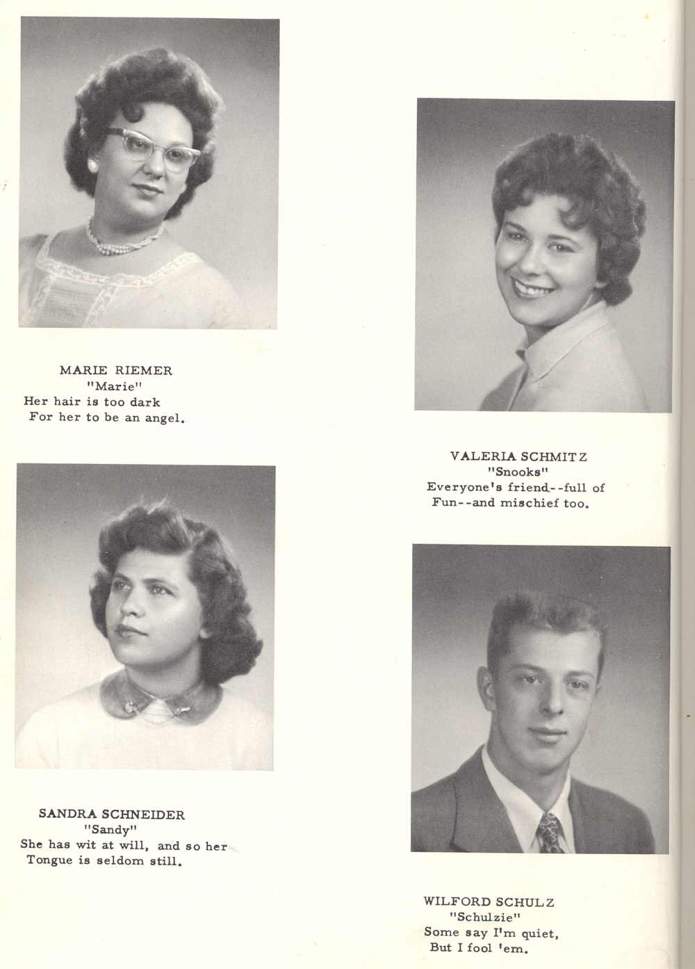 1959 Elkhart Lake High School, Page 14: Marie Riemer, Valeria Schmitz, Sandra Schneider, Wilford Schulz.