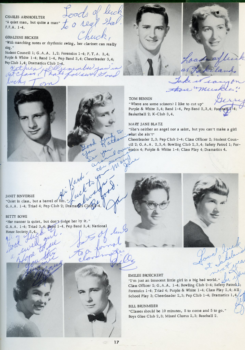 1959 Kiel High School, Page 17: Charles Arnhoelter, Geraldine Becker, Tom Bennin, Mary Jane Blatz, Janet Binversie, Betty Bowe, Emilee Broeckert, Bill Brunmeier.
