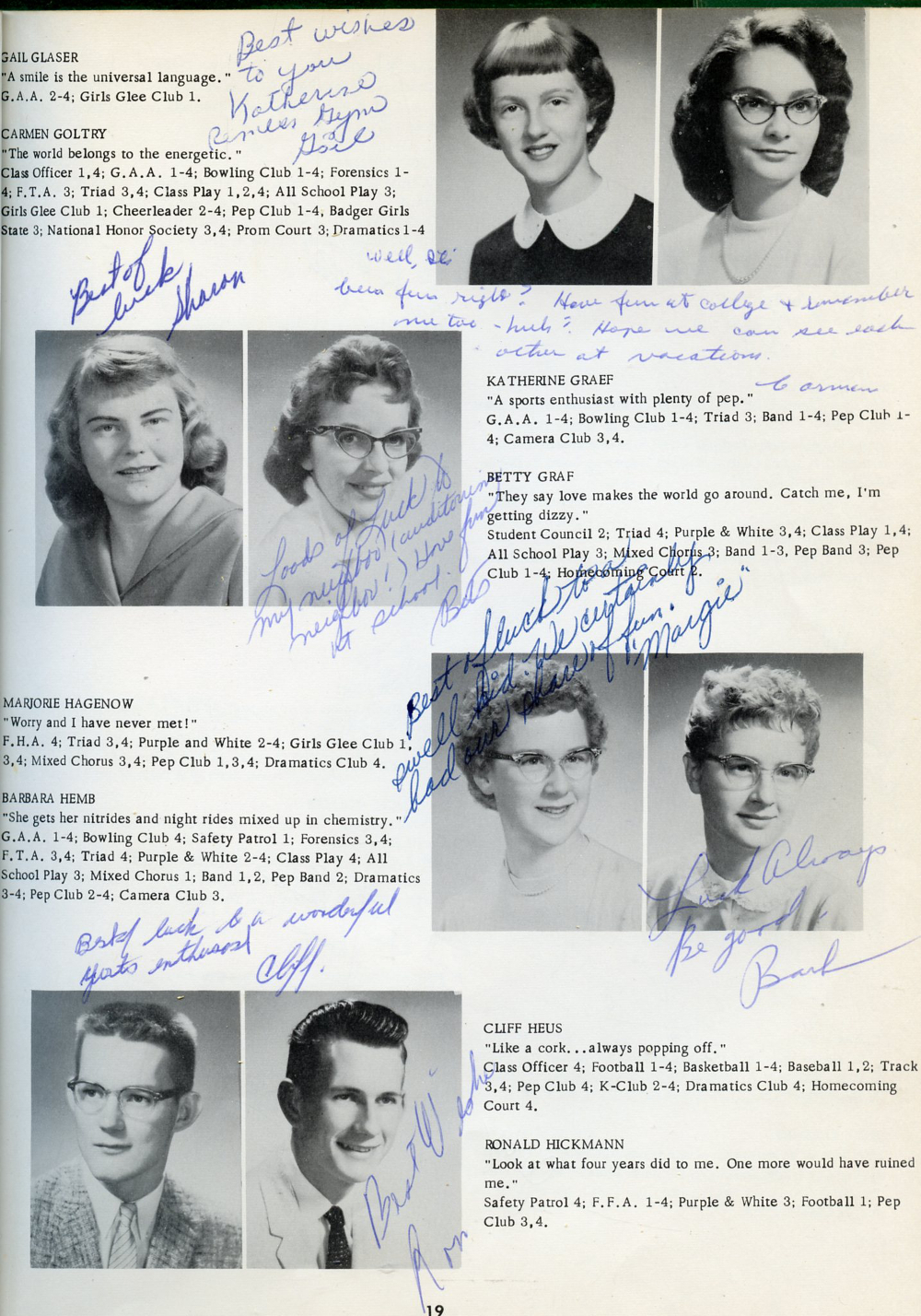 1959 Kiel High School, Page 19: Gail Glaser, Carmen Goltry, Katherine Graef, Betty Graf, Marjorie Hagenow, Barbara Hemb, Cliff Heus, Ronald Hickmann.