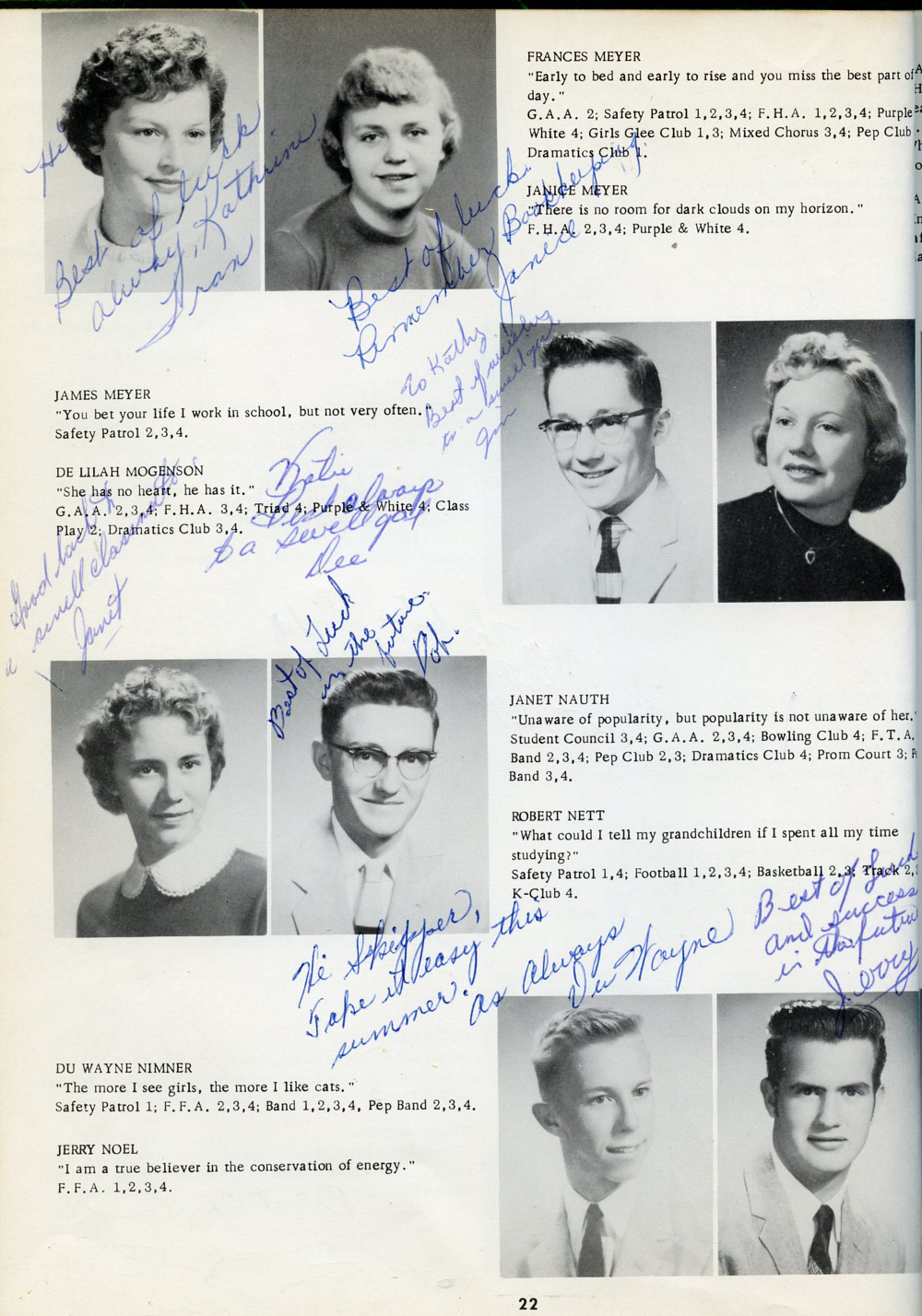 1959 Kiel High School, Page 22: Frances Meyer, Janice Meyer, James Meyer, De Lilah Mogenson, Janet Nauth, Robert Nett, Du Wayne Nimner, Jerry Noel.