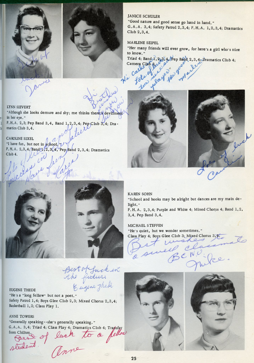 1959 Kiel High School, Page 25: Janice Schuler, Marlene Seipel, Lynn Sievert, Caroline Sixel, Karen Sohn, Michael Steffen, Eugene Thede, Anne Towers.
