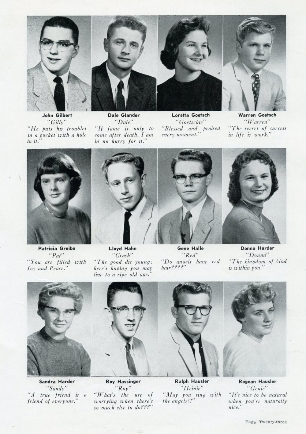 1959 Plymouth High School, Page 23: John Gilbert, Dale Glander, Loretta Goetsch, Warren Goetsch, Patricia Greibe, Lloyd Hahn, Gene Halle, Donna Harder, Sandra Harder, Roy Hassinger, Ralph Hausler, Rogean Hausler.