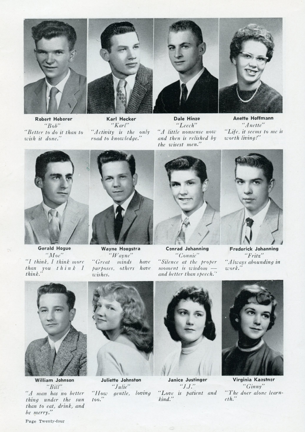 1959 Plymouth High School, Page 24: Robert Heberer, Karl Hecker, Dale Hinze, Anette Hoffmann, Gerald Hogue, Wayne Hoogstra, Conrad Johanning, Frederick Johanning, William Johnson, Juliette Johnston, Janice Justinger, Virginia Kaestner.