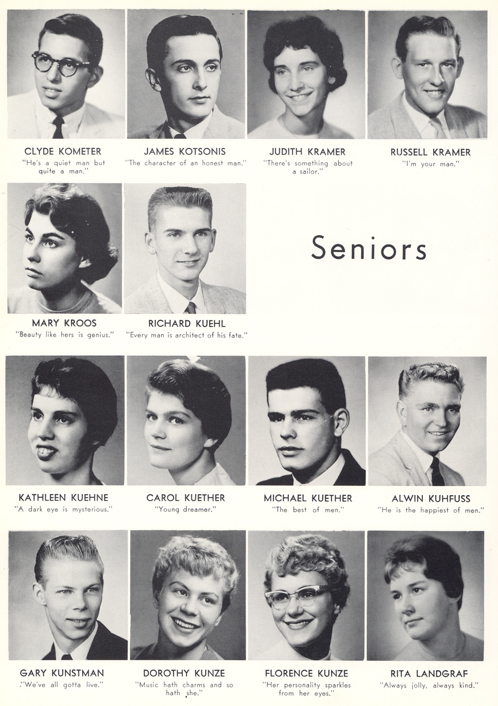High School, Page 102: Clyde Kometer, James Kotsonis, Judith Kramer, Russell Kramer, Mary Kroos, Richard Kuehl, Kathleen Kuehne, Carol Kuether, Michael Kuether, Alwin Kuhfuss, Gary Kunstman, Dorothy Kunze, Florence Kunze, Rita Landgraf.
