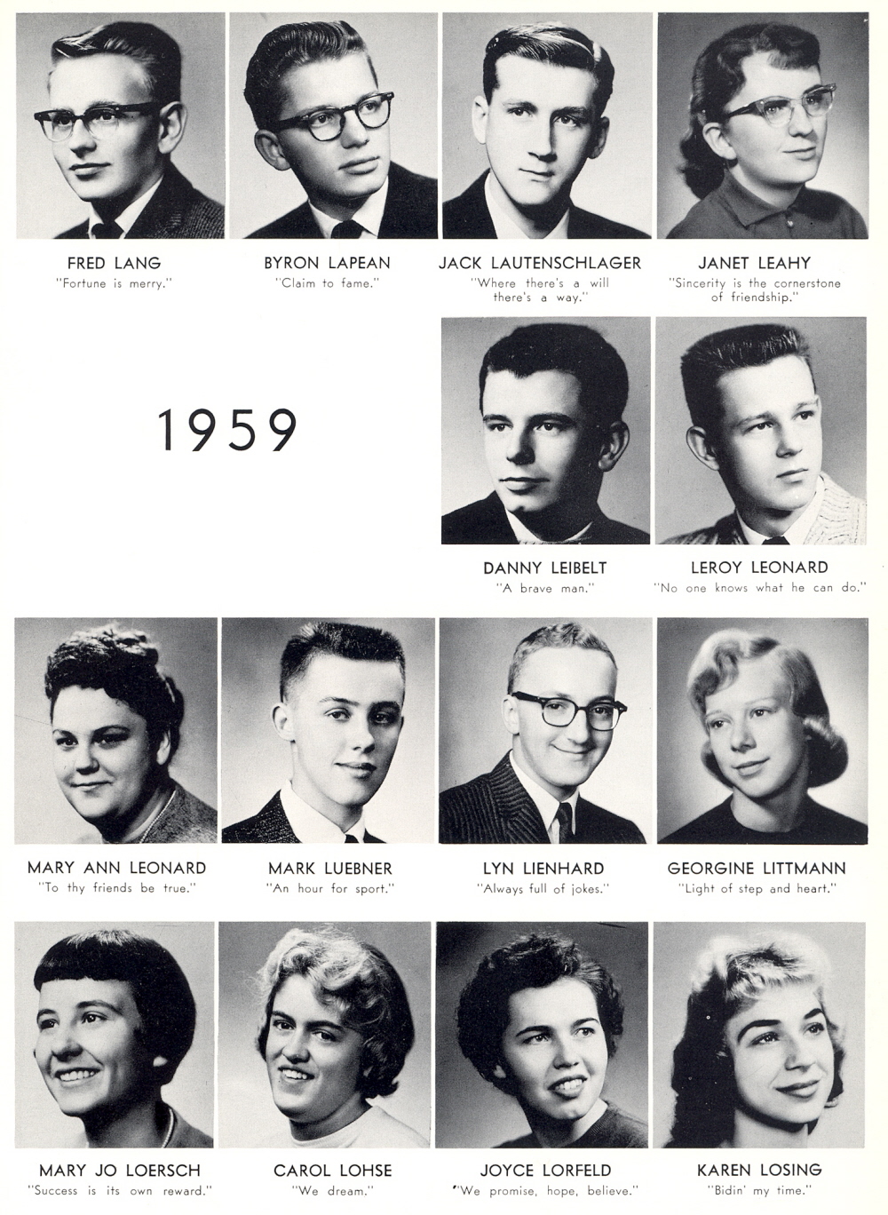 High School, Page 103: Fred Lang, Byron Lapean, Jack Lautenschlager, Janet Leahy, Danny Liebelt, Leroy Leonard, Mary Ann Leonard, Mark Luebner, Lyn Lienhard, Georgine Littmann, Mary Jo Loersch, Carol Lohse, Joyce Lorfeld, Karen Losing.