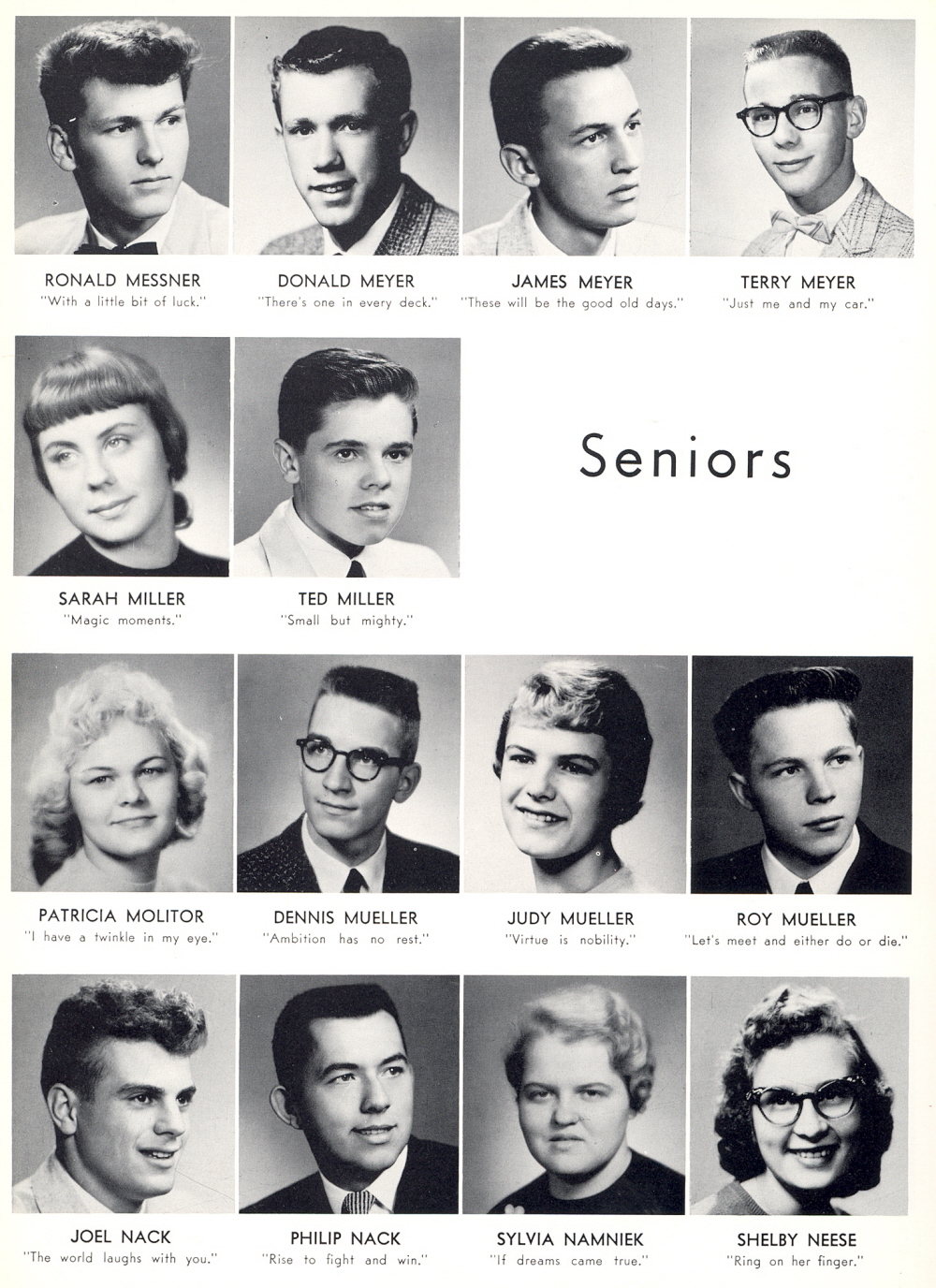 1959 Sheboygan Central High School, Page 106: Ronald Messner, Donald Meyer, James Meyer, Terry Meyer, Sarah Miller, Ted Miller, Patricia Molitor, Dennis Mueller, Judy Mueller, Roy Mueller, Joel Nack, Philip Nack, Sylvia Namniek, Shelby Neese.