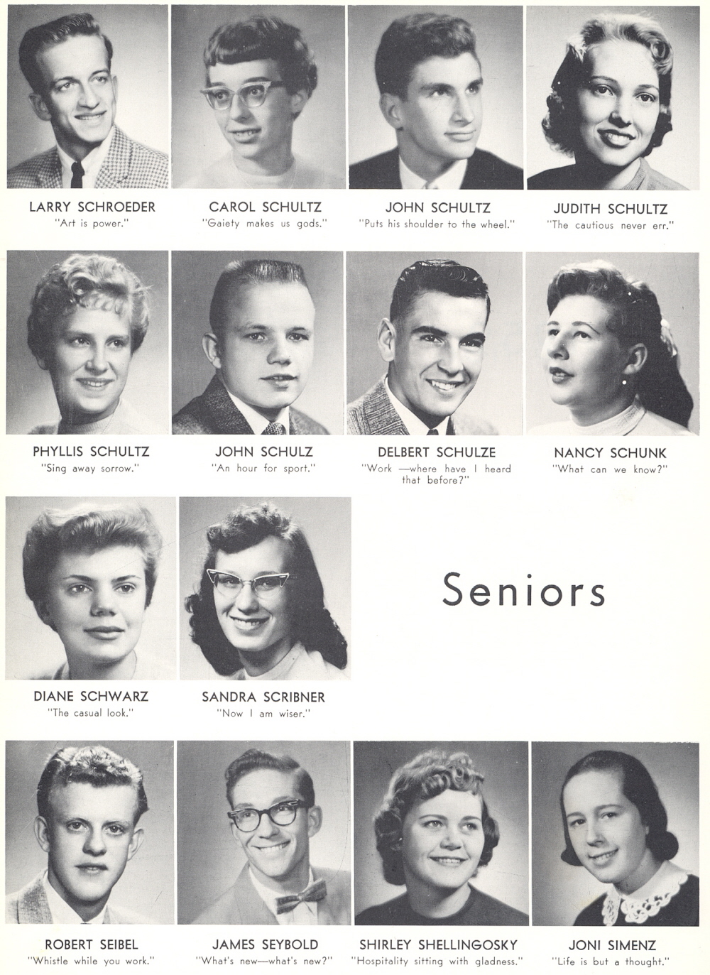 High School, Page 112: Larry Schroeder, Carol Schultz, John Schultz, Judith Schultz, Phyllis Schultz, John Schulz, Delbert Schulze, Nancy Schunk, Diane Schwarz, Sandra Scribner, Robert Seibel, James Seybold, Shirley Shellingosky, Joni Simenz.