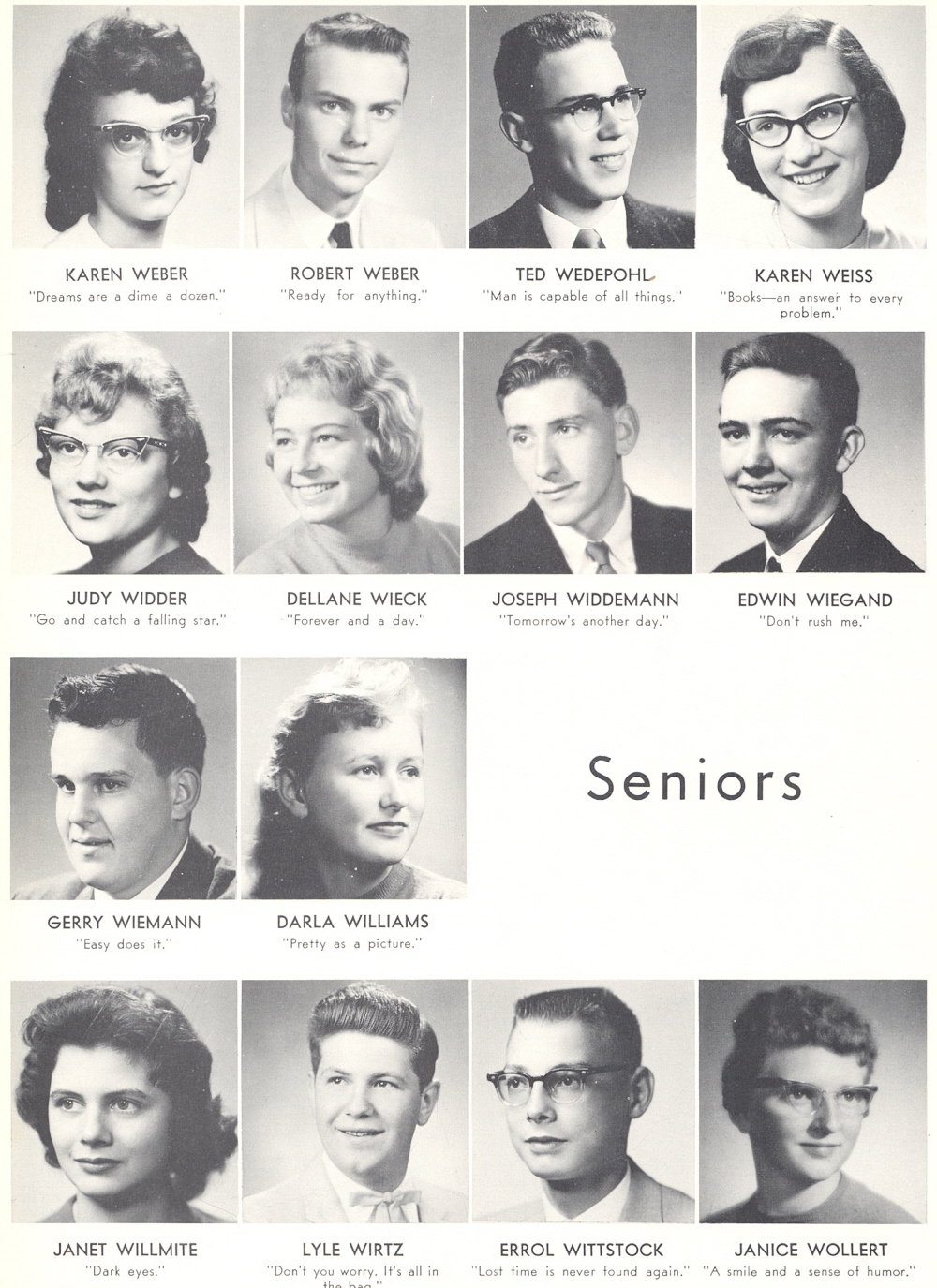 1959 Sheboygan Central High School, Page 116: Karen Weber, Robert Weber, Ted Wedepohl, Karen Weiss, Judy Widder, Dellane Wieck, Joseph Widdemann, Edwin Wiegand, Gerry Wiemann, Darla Williams, Janet Willmite, Lyle Wirtz, Error Wittstock, Janice Wollert.