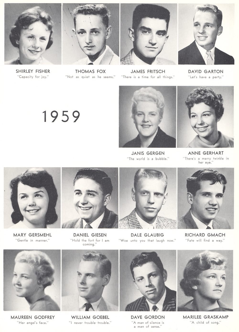 High School, Page 95: Shirley Fisher, Thomas Fox, James Fritsch, David Garton, Janis Gergen, Anne Gerhart, Mary Gersmehl, Daniel Giesen, Dale Glaubig, Richard Gmach, Maureen Godfrey, William Goebel, Dave Gordon, Marilee Graskamp.