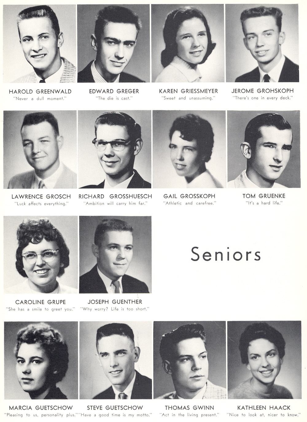 High School, Page 96: Harold Greenwald, Edward Greger, Karen Griessmeyer, Jerome Grohskoph, Lawrence Grosch, Richard Grosshuesch, Gail Grosskoph, Tom Gruenke, Caroline Grupe, Joseph Guenther, Marcia Guetschow, Steve Guetschow, Thomas Gwinn, Kathleen Haack.