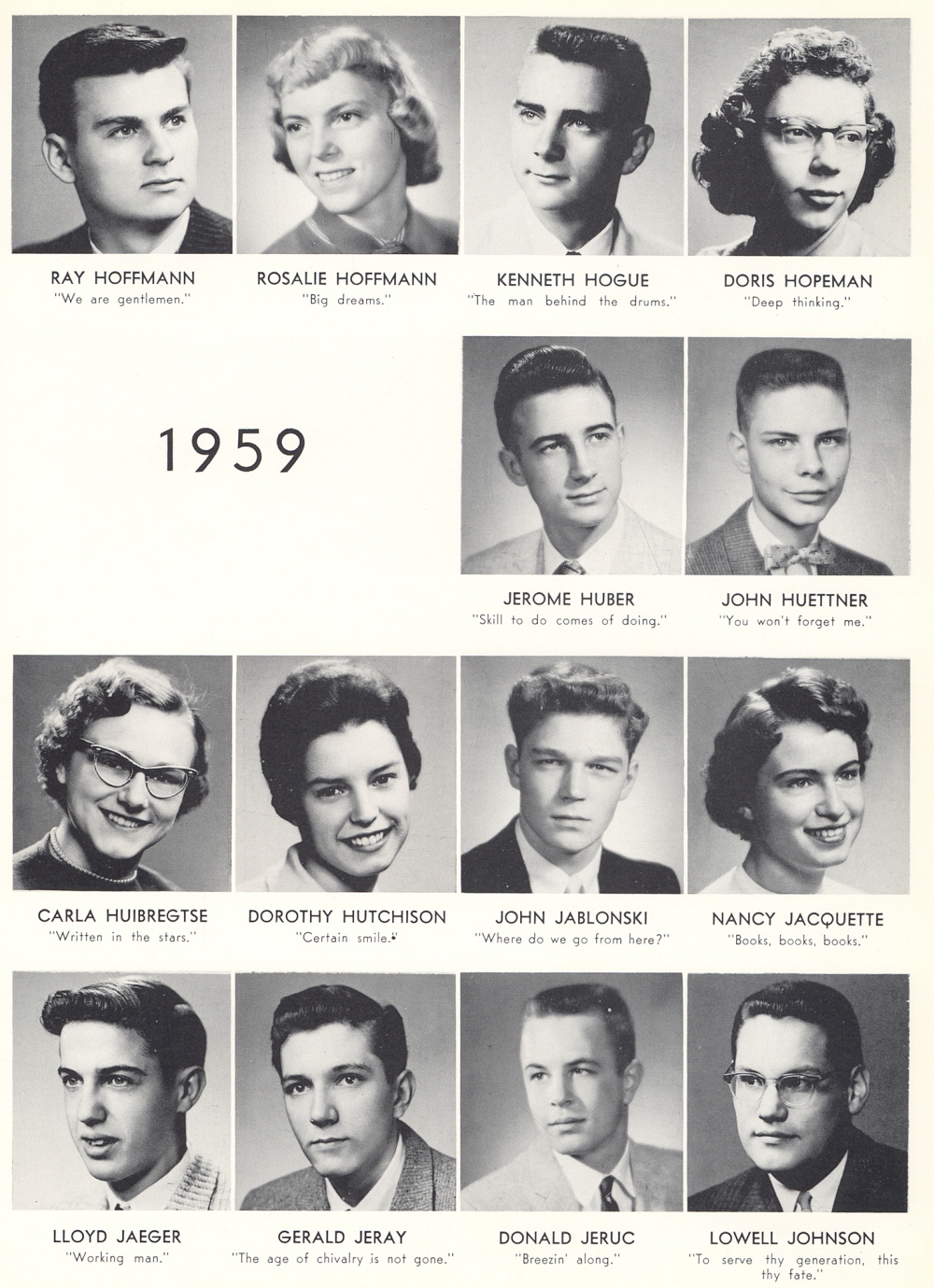 1959 Sheboygan Central High School, Page 99: Ray Hoffmann, Rosalie Hoffmann, Kenneth Hogue, Doris Hopeman, Jerome Huber, John Huettner, Carla Huibregtse, Dorothy Hutchinson, John Jablonski, Nancy Jacquette, Lloyd Jaeger, Gerald Jeray, Donald Jeruc, Lowell Johnson.