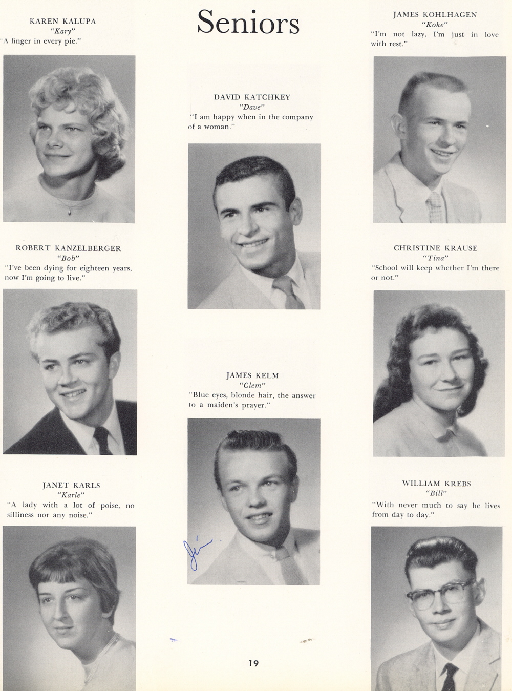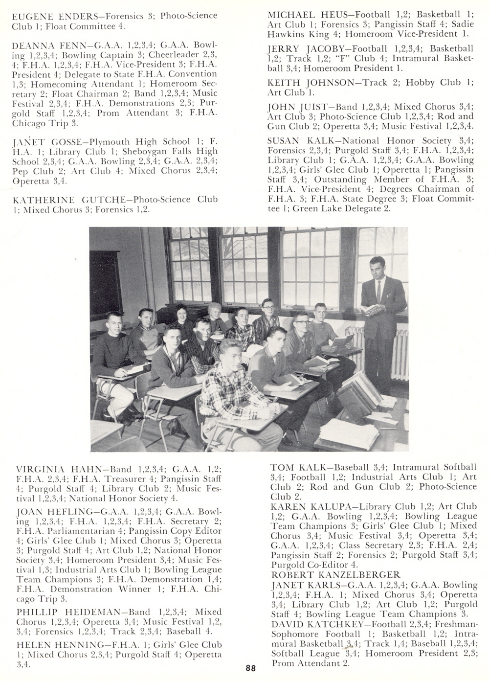1959 Sheboygan Falls High School, Pages 19, 88 and 89: Karen Kalupa, Robert Kanzelberger, Janet Karls, David Katchkey, James Kelm, James Kohlhagen, Christine Krause, William Krebs.