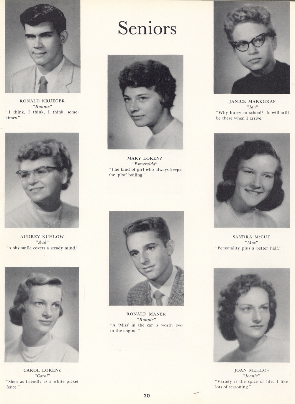 1959 Sheboygan Falls High School, Pages 20 and 89: Ronald Krueger, Audrey Kuhlow, Carol Lorenz, Mary Lorenz, Ronald Maner, Janice Markgraf, Sandra McCue, Joan Mehlos.