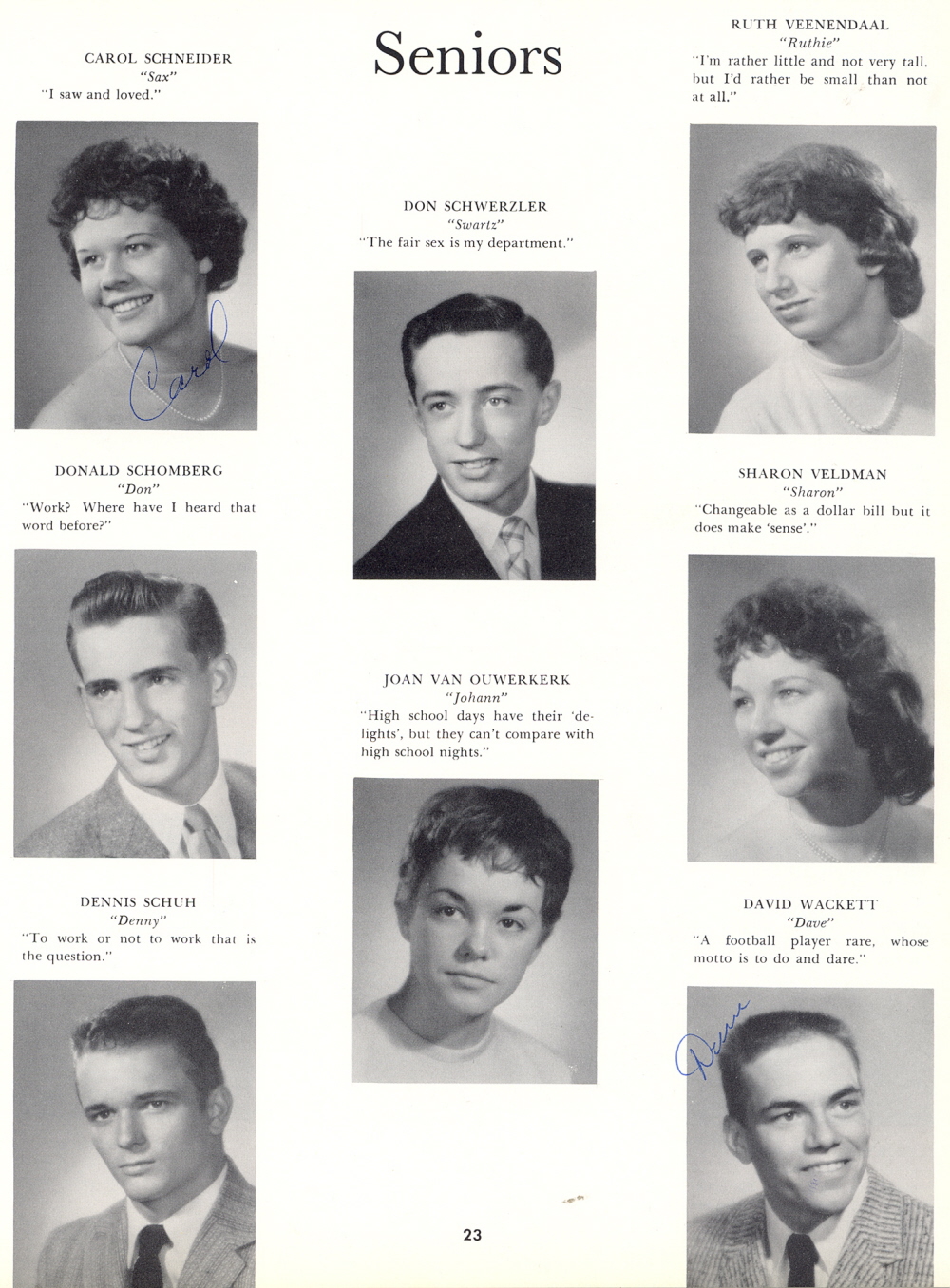 1959 Sheboygan Falls High School, Pages 23, 90 and 91: Carol Schneider, Donald Schomberg, Dennis Schuh, Don Schwerzler, Joan Van Ouwerkerk, Ruth Veenendaal, Sharon Veldman, David Wackett.
