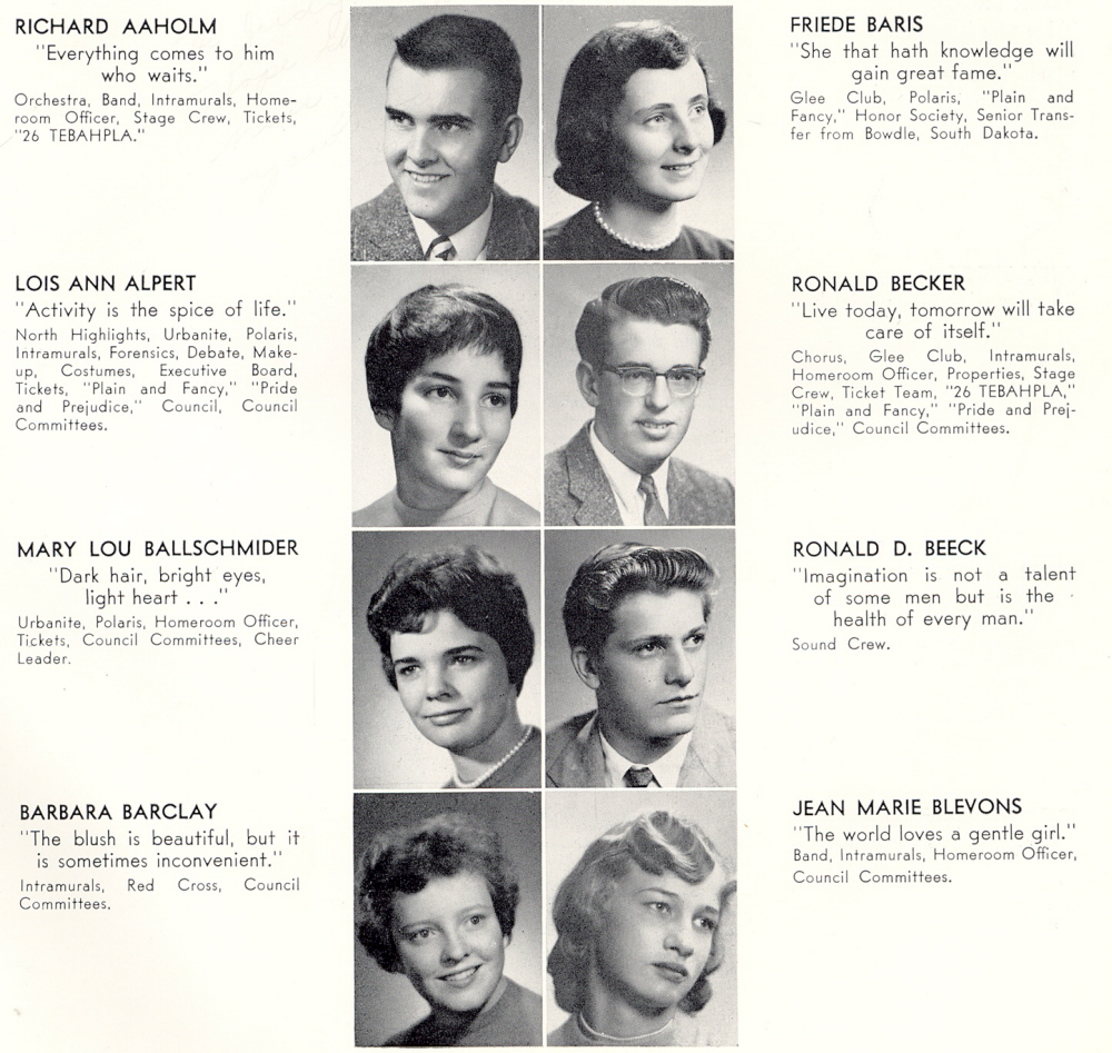 1959 Sheboygan North High School, Page 17: Richard Aaholm, Lois Ann Alpert, Mary Lou Ballschmider, Barbara Barclay, Friede Baris, Ronald Becker, Ronald D. Beeck, Jean Marie Blevons.