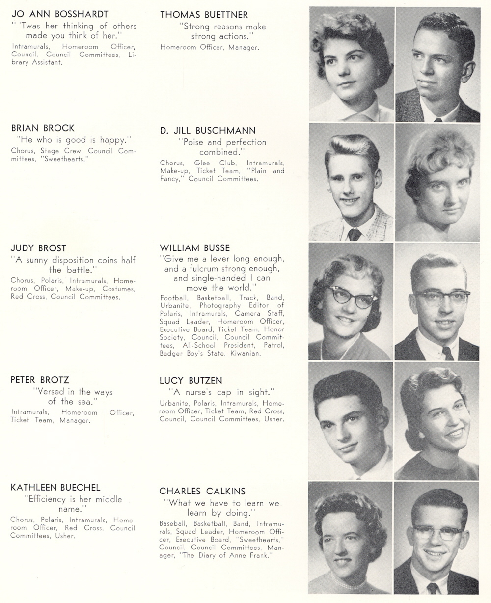 1959 Sheboygan North High School, Page 18: Jo Ann Bosshardt, Brian Brock, Judy Brost, Peter Brotz, Kathleen Buechel, Thomas Buettner, D. Jill Buschmann, William Busse, Lucy Butzen, Charles Calkins.