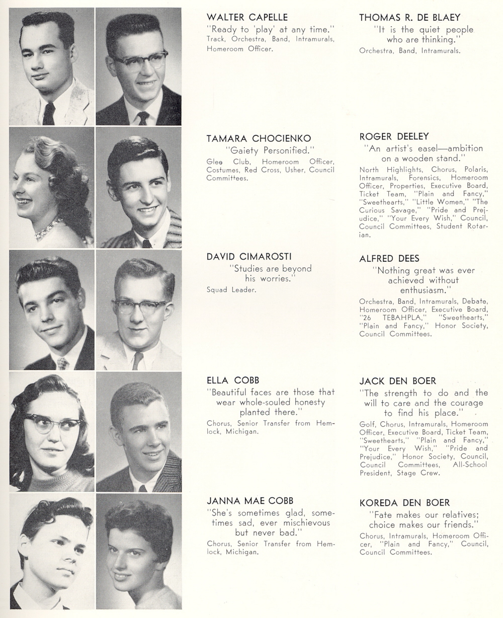 1959 Sheboygan North High School, Page 19: Walter Capelle, Tamara Chocienko, David Cimarosti, Ella Cobb, Janna Mae Cobb, Thomas R. De Blaey, Roger Deeley, Alfred Dees, Jack Den Boer, Koreda Den Boer.