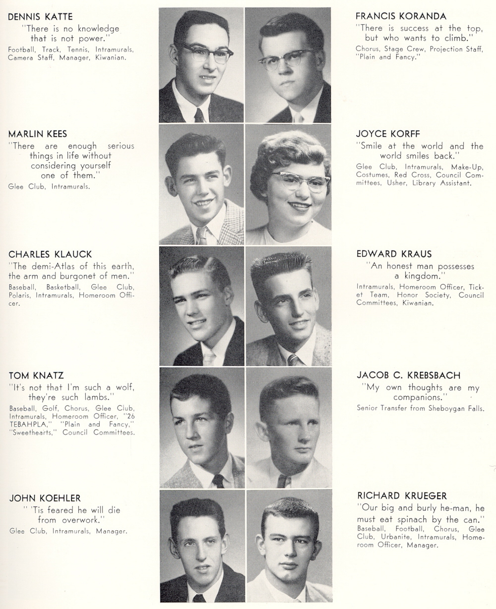 1959 Sheboygan North High School, Page 25: Dennis Katte, Marlin Kees, Charles Klauck, Tom Knatz, John Koehler, Francis Kordanda, Joyce Korff, Edward Kraus, Jacob C. Krebsbach, Richard Krueger.