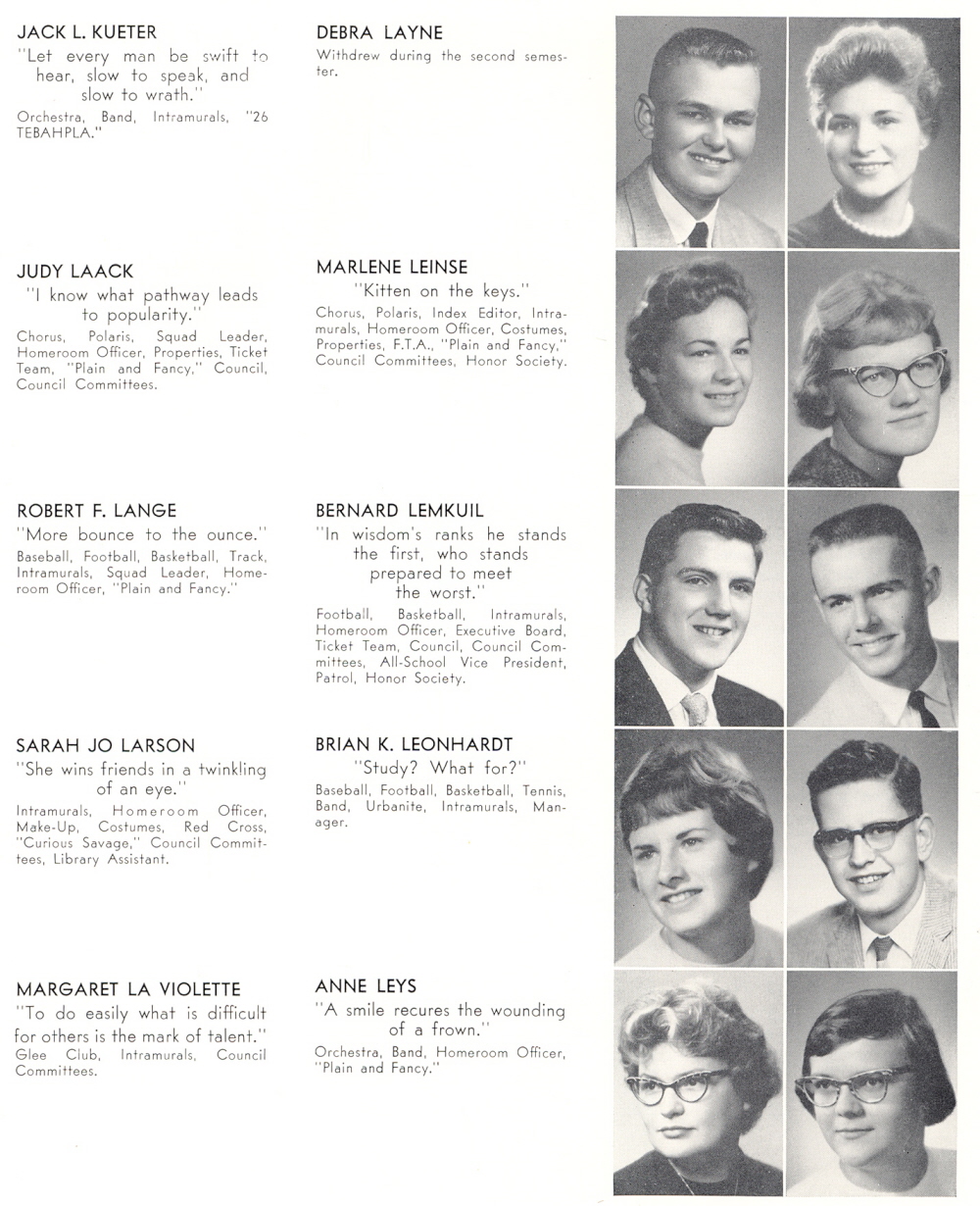 1959 Sheboygan North High School, Page 26: Jack L. Kueter, Judy Laack, Robert F. Lange, Sarah Jo Larson, Margaret La Violette, Debra Layne, Marlene Leinse, Bernard Lemkuil, Brian K. Leonhardt, Anne Leys.