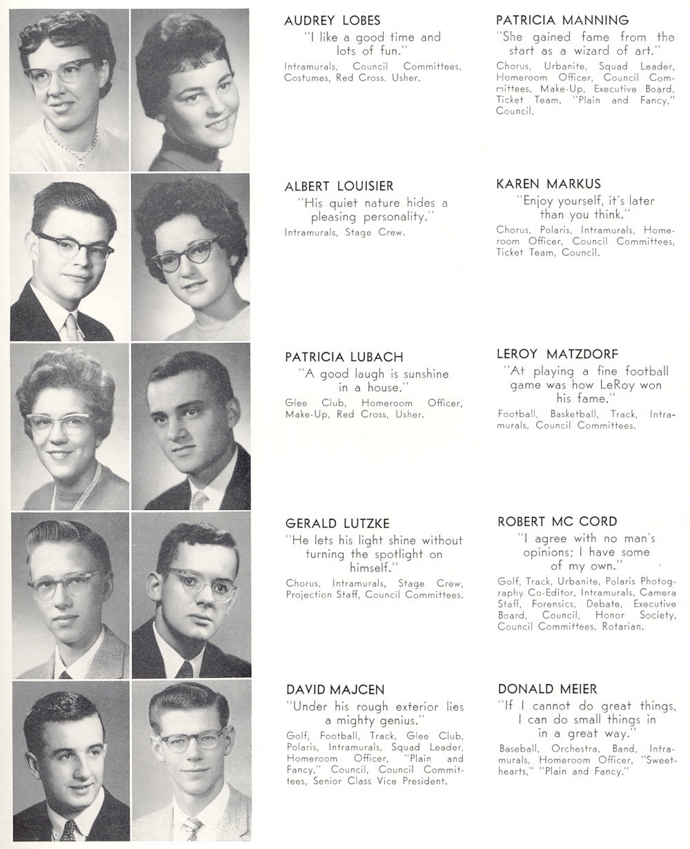 1959 Sheboygan North High School, Page 27: Audrey Lobes, Albert Louisier, Patricia Lubach, Gerald Lutze, David Majcen, Patricia Manning, Karen Markus, Leroy Matzdorf, Robert Mc Cord, Donald Meier.