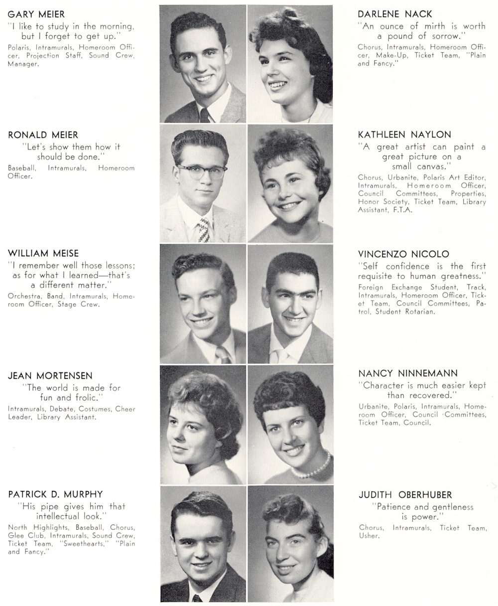 1959 Sheboygan North High School, Page 28: Gary Meier, Ronald Meier, William Meise, Jean Mortensen, Patrick D. Murphy, Darlene Nack, kathleen Naylon, Vincenzo Nicolo, Nancy Ninnemann, Judith Oberhuber.