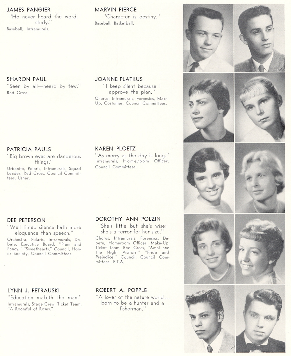 1959 Sheboygan North High School, Page 30: James Pangier, Sharon Paul, Patricia Pauls, Dee Peterson, Lynn J. Petrauski, Marvin Pierce, Joanne Platkus, Karen Ploetz, Dorothy Ann Polzin, Robert A. Popple.