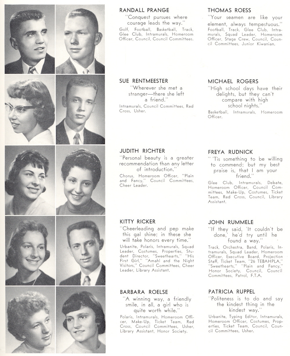 1959 Sheboygan North High School, Page 31: Randall Prange, Sue Rentmeester, Judith Richter, Kitty Ricker, Barbara Roelse, Thomas Roess, Michael Rogers, Freya Rudnick, John Rummele, Patricia Ruppel.