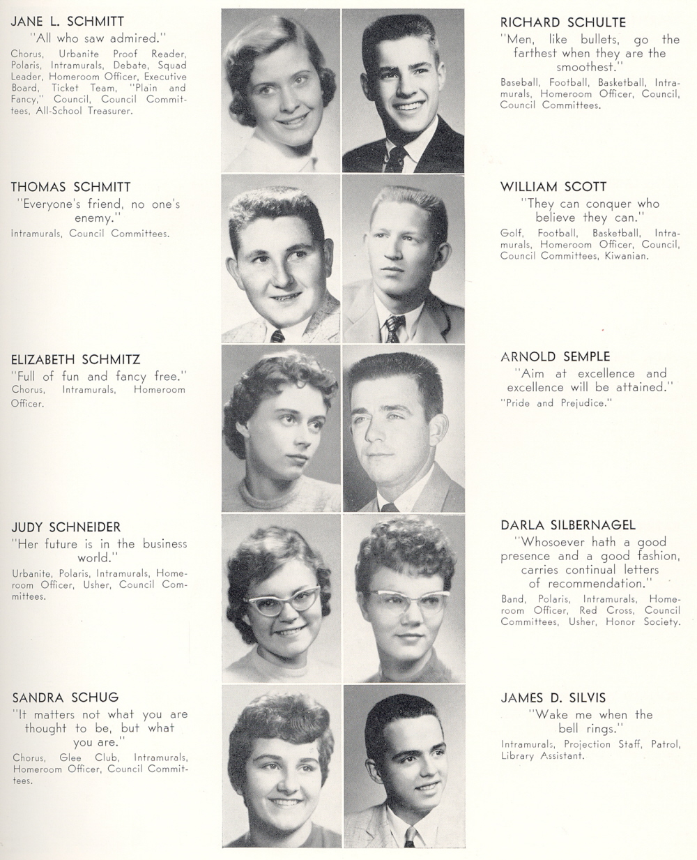 1959 Sheboygan North High School, Page 33: Jane L. Schmitt, Thomas Schmitt, Elizabeth Schmitz, Judy Schneider, Sandra Schug, Richard Schulte, William Scott, Arnold Semple, Darla Silbernagel, James D. Silvas.