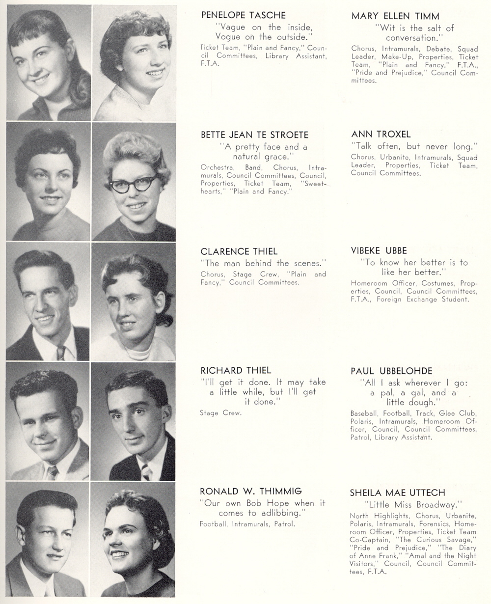 1959 Sheboygan North High School, Page 35: Penelope Tasche, Bette Jean Te Stroete, Clarence Thiel, Richard Thiel, Ronald W. Thimmig, Mary Ellen Timm, Ann Troxel, Vibeke Ubbe, Paul Ubbelohde, Sheila Mae Uttech.