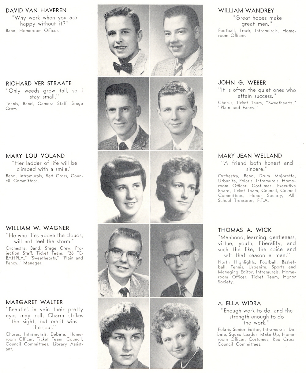 1959 Sheboygan North High School, Page 36: David Van Haveren, Richard Ver Straate, Mary Lou Voland, William W. Wagner, Margaret Walter, William Wandrey, John G. Weber, Mary Jean Welland, Thomas A. Wick, A. Ella Widra.