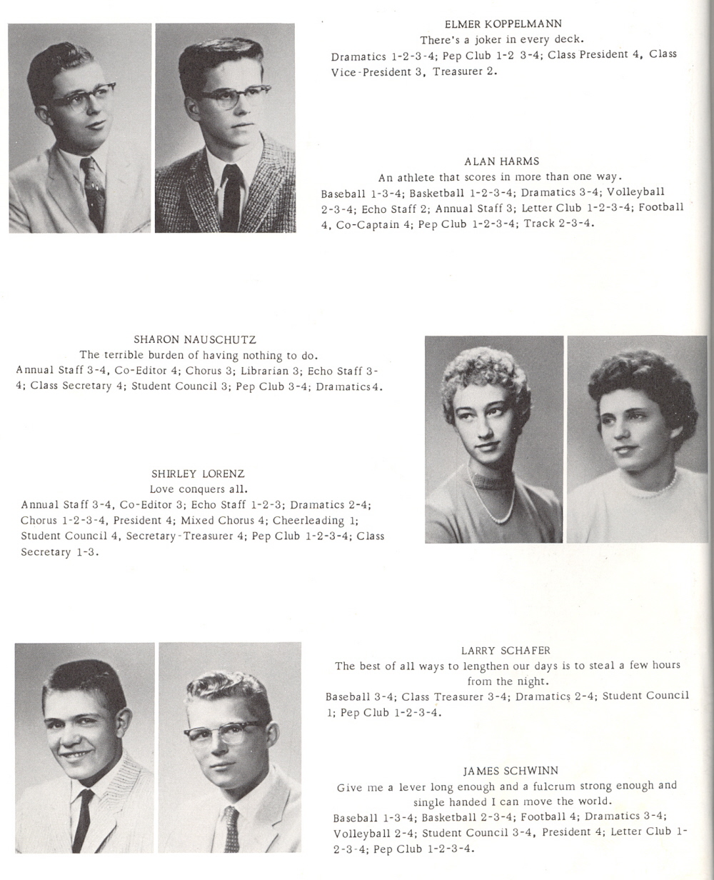 1960 Howards Grove High School, Page 10: Elmer Koppelmann, Alan Harms, Sharon Nauschutz, Shirley Lorenz, Larry Schafer, James Schwinn.