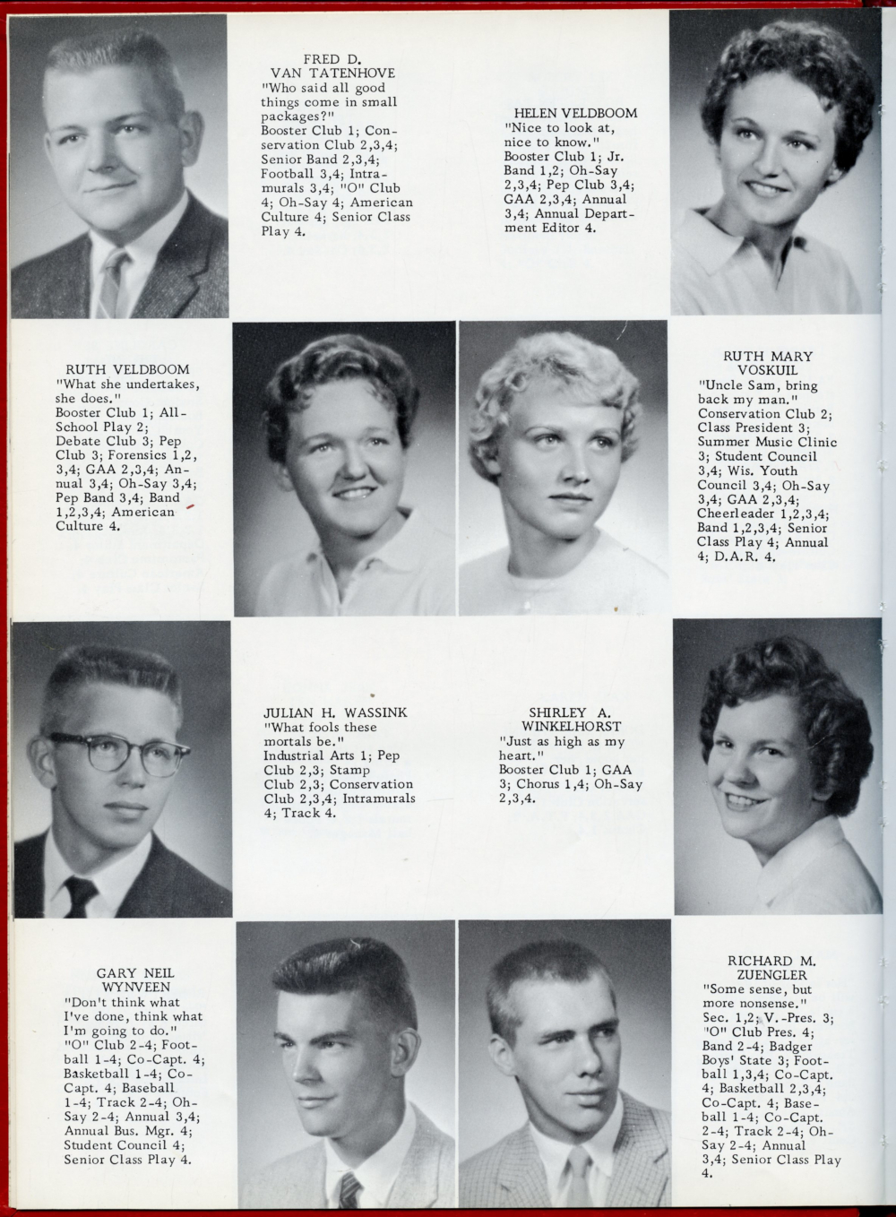 1960 Oostburg High School Yearbook Page 10: Fred D. Van Tatenhove, Helen Veldbom, Ruth Veldboom, Ruth Mary Voskuil, Julian H. Wassink, Shirley A. Winkelhorst, Gary Neil Wynveen, Richard M. Zuengler.