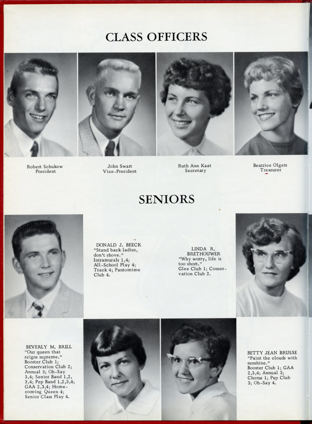 1960 Oostburg High School Yearbook Page 4: Donald J. Beeck, Linda R. Brethouwer, Beverly M. Brill, Betty Jean Brusse.