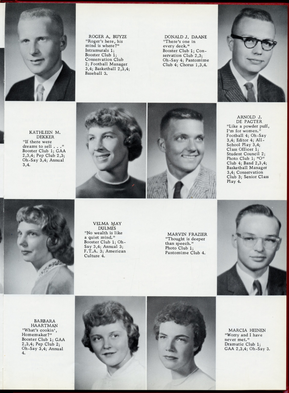 1960 Oostburg High School Yearbook Page 5: Roger A. Buyze, Donald J. Daane, Kathleen M. Dekker, Arnold J. De Pagter, Velma May Dulmes, Marvin Frazier, Barbara Haartman, Marcia Heinen.