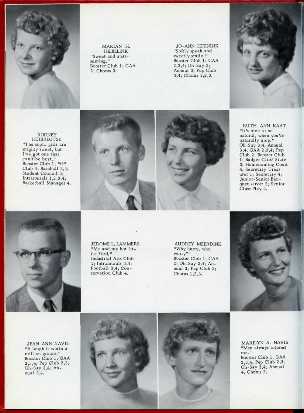 1960 Oostburg High School Yearbook Page 6: Marian H. Hilbelink, Jo-Ann Huenink, Rodney Huibregtse, Ruth Ann Kaat, Jerome L. Lammers, Audrey Meerdink, Jean Ann Navis, Marilyn A. Navis.