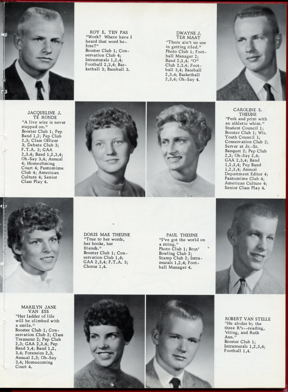 1960 Oostburg High School Yearbook Page 9: Roy E. Ten Pas, Dwayne J. Ter Maat, Jacqueline J. Te Ronde, Caroline S. Theune, Doris Mae Theune, Paul Theune, Marilyn Jane Van Ess, Robert Van Stelle.