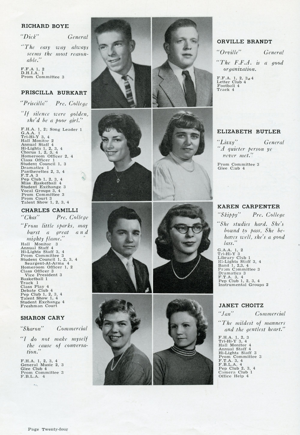 1960 Plymouth High School, Page 24: Richard Boyle, Orville Brandt, Priscilla Burkart, Elizabeth Butler, Charles Camilli, Karen Carpenter, Sharon Cary, Janet Choitz.