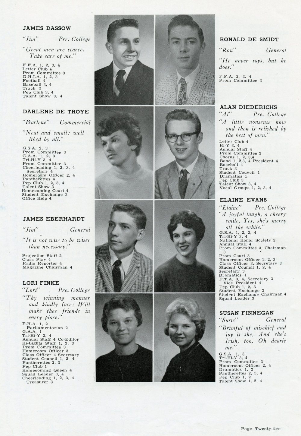 1960 Plymouth High School, Page 25: James Dassow, Ronald De Smidt, Darlene De Troye, Alan Diederichs, James Eberhardt, Elaine Evans, Lori Finke, Susan Finnegan.