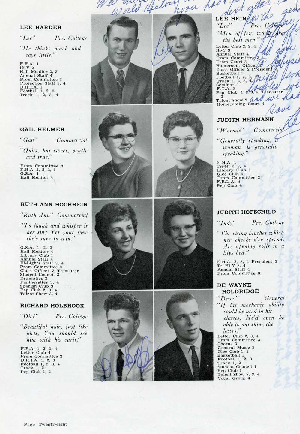 1960 Plymouth High School, Page 28: Lee Harder, Lee Hein, Gail Helmer, Judith Hermann, Ruth Ann Hochrein, Judith Hofschild, Richard Holbrook, De Wayne Holdridge.
