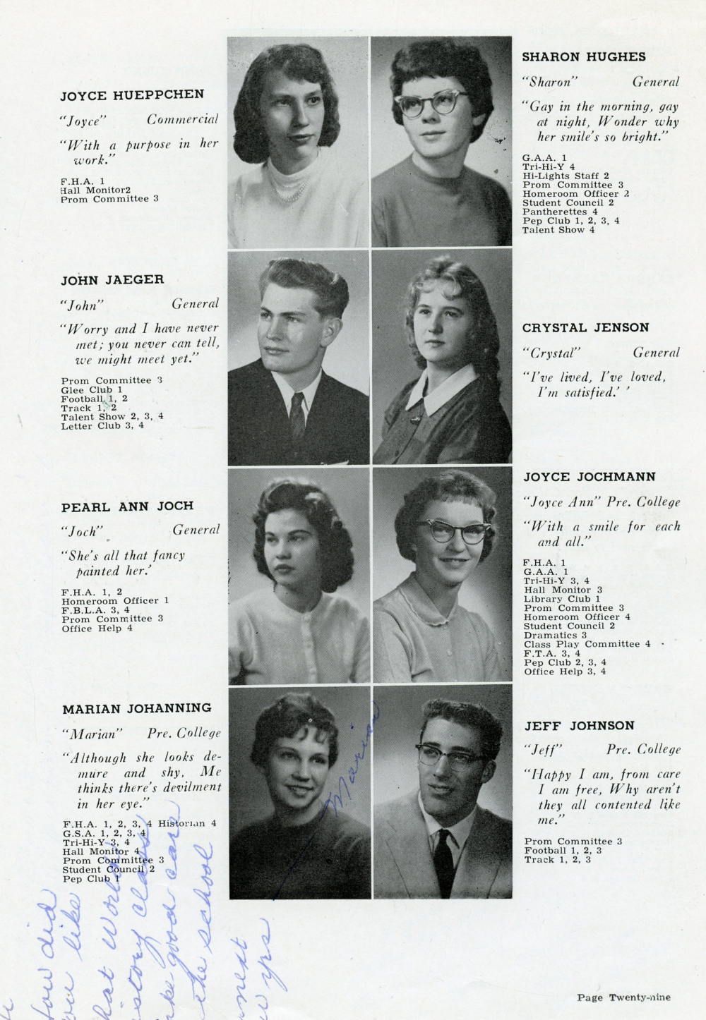 1960 Plymouth High School, Page 29: Joyce Hueppchen, Sharon Hughes, John Jaeger, Crystal Jenson, Pearl Ann Joch, Joyce Jochmann, Marian Johanning, Jeff Johnson.